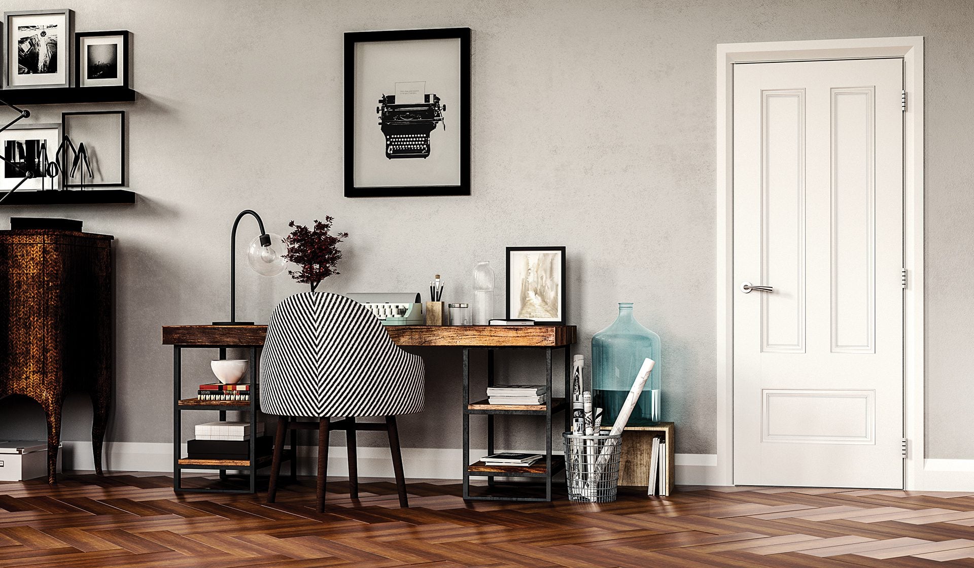 The solid door features two slim vertical panels neatly underscored by a chunky horizontal panel – all three beautifully finished with bevelled edges.
