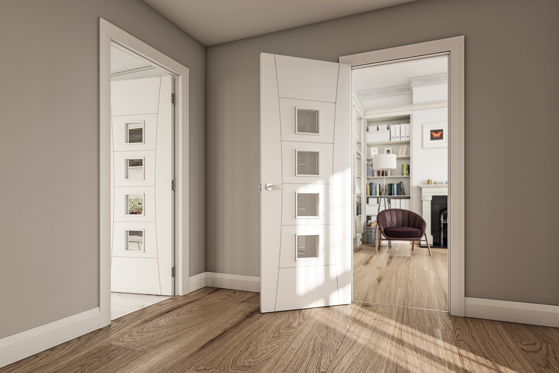 This unique door combines a clever combination of lines and curves. The perfectly spaced horizontal lines are strikingly accentuated by the gentle vertical curves. In the glazed door, four square panes of clear toughened glass are set neatly between the vertical lines.
